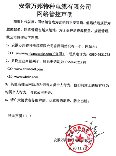 鄭重聲明:安徽萬邦特種電纜有限公司官方網站為:www_wanbangcable_com.fsjsh.com.cn,除此之外無任何子網站或合作網站,其余均為假冒偽劣。電話:0550-7621728 13485756353 地 址:安徽省天長市滁州高新技術產業開發區經四路29號
